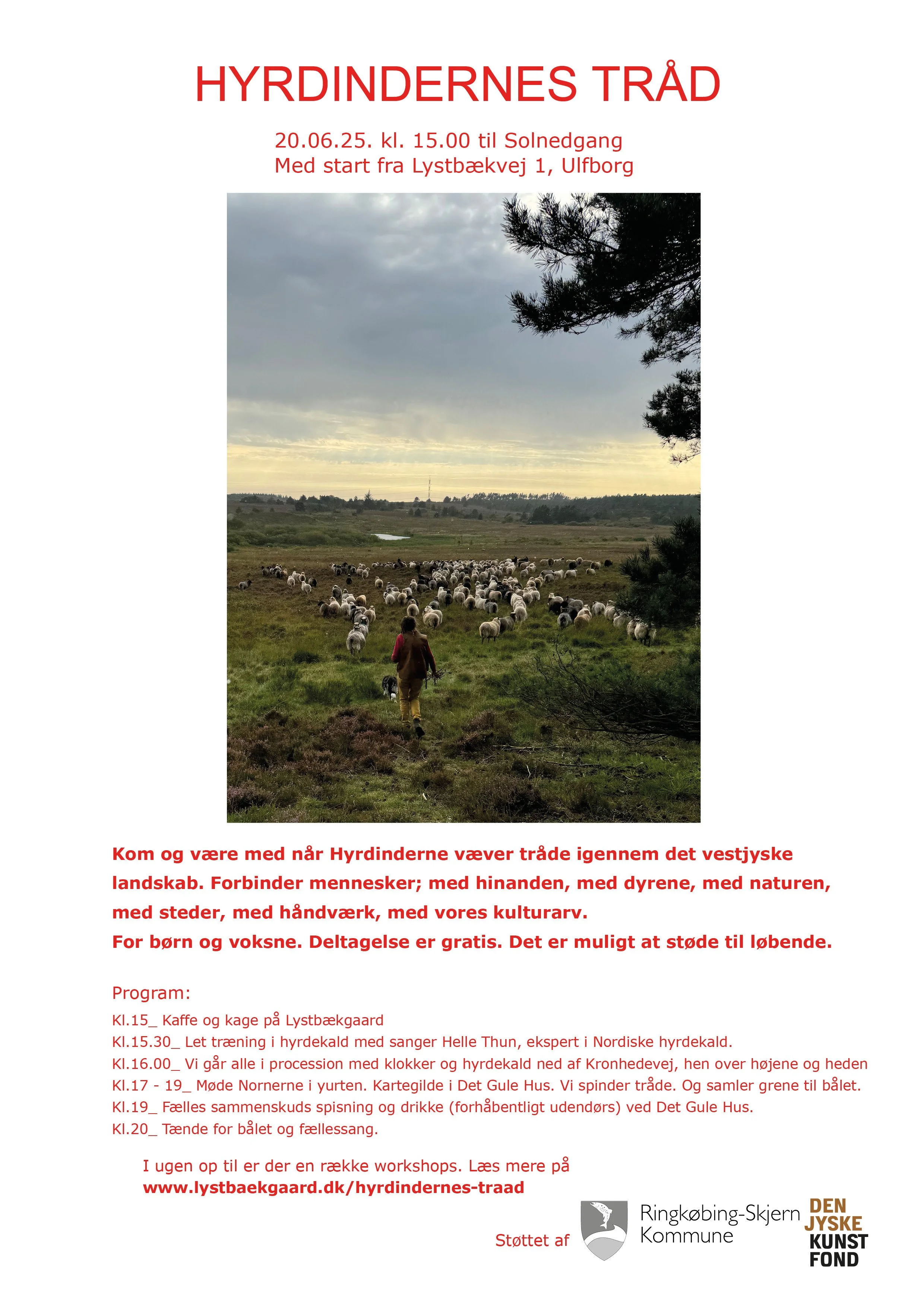 Høre hyrdens kald og gå ud i landskabet. Her kan man vandre med fårene og oplev at være til stede i den storslåede natur med dens gravhøje, hede, vilde heste og skov. Endeligt kommer mødet med de 3 Norner, der sidder og spinder med fårets uld. Her kan man lægge sig i de bløde fåreskind. Om eftermiddagen I Det Gule Hus er der cafe og kartegilde. Inden solnedgang tænder vi for et midsommers bål, fejre heksens hjemkomst og synger hedens sange.For børn og voksne. Deltagelse er gratis. Det er muligt at støde til løbende.